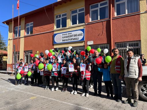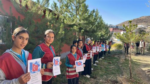 Aynı zamanda vatan şehidimizin adının yer aldığı okul bahçesinde toplanan öğrenciler, şehitlerin adını taşıyan görselleri açtılar, Filistin bayrak renklerinden oluşan balonları uçurdular.