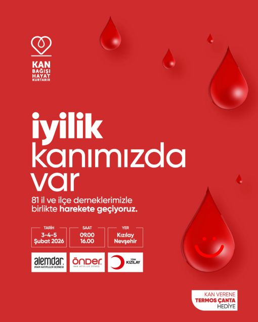 Alemdar İmam Hatipliler Derneği olarak iyilik hareketine destek veriyor ve 3-4-5 Şubat 2026 tarihlerinde Türk Kızılay Nevşehir Şubesi’nde kan bağışında bulunacağız. Dernek mensuplarımızı ve binlerce gönüllümüzü kan vermeye davet ediyoruz.
